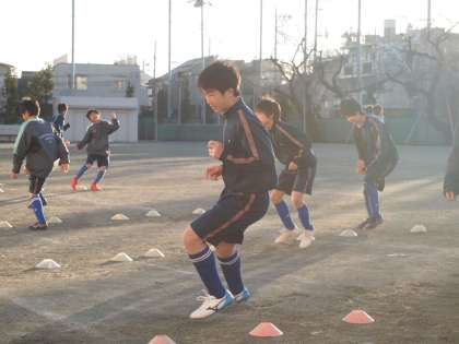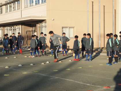 今朝も冷え込む校庭でサッカー部が朝練習に励んでいます。顧問の先生からステップの基本を習い、みんなで取り組んでいます。体を暖めてることも兼ねた本格的な基礎練習です。