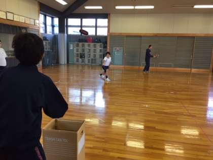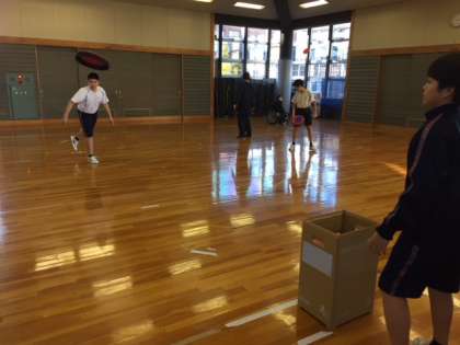 本日の軽運動部は、KANJAMを楽しんでいます。フライングディスクを投げて箱の中に入れて得点を競います。投げる回数を重ねるごとに命中率が上がってきました。(大居)