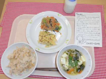 今日は里芋ごはんが主食の献立です。里芋はいもの中でもヌルヌルとした成分が多く入っているのが特徴です。このヌルヌルは肉や魚のたんぱく質の消化や吸収を助ける働きがあります。今日は、その里芋を油揚げ、鶏肉、にんじんを一緒に炊いた体に優しい炊き込みご飯を出しました。