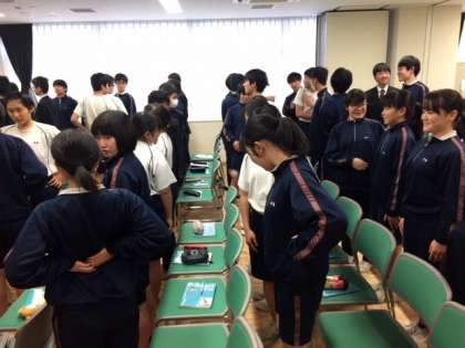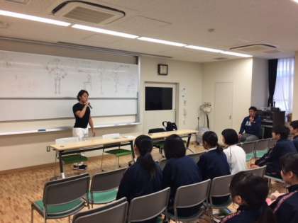 スポーツインストラクターをお招きし、体づくりについての授業をしていただきました。「姿勢を意識して1日過ごすだけで、ご飯1杯分くらい消費カロリーに差がでる」という話を聞いて、「へーっ!」とみんなの背筋が伸びました。(大居)
