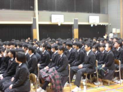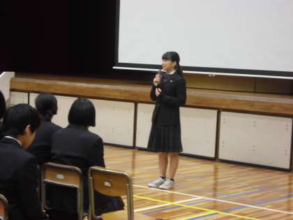 本日の1時間目に、3年生の学年集会が行われました。まず学級委員から冬休みの過ごし方を動画で説明してくれました。動画の途中にクイズがあり、生徒たちは楽しく確認していました。動画の一部が本日配布された学年だよりに載っていますので、ぜひご覧ください。田村先生からは学習面について、加藤先生からは2学期の振り返りと生活面についてお話がありました。冬休みは健康に気をつけて、規則正しい生活を送ってください。(伊井)