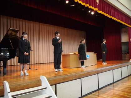 今日の終業式、実は「終業式」としては平成時代の最後となります。2学期最終日も、体育館に集まったフナキボ生たちはいつものように3年生から私語が波を打つように無くなり、全教職員が集まる時には静寂に包まれていました。また始業式と終業式で歌う校歌の指揮者と伴奏者が今日で最後となるため、次の新しい2人との‘引き継ぎ式’がありました。4人からは素直なフナキボ生らしいコメントがあり、生徒から惜しみない拍手が贈られました。
