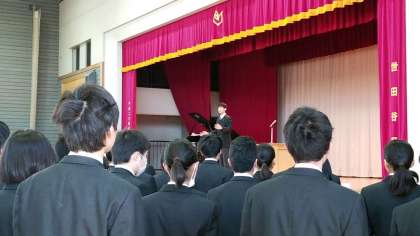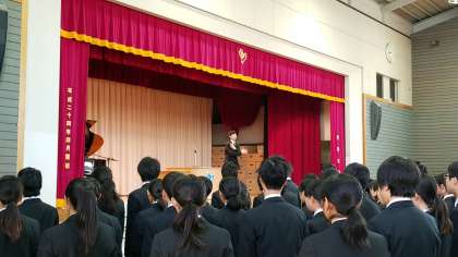 本日の始業式では、2年生の指揮者・伴奏者が舞台に立ち、初めて実際に校歌の指揮と伴奏を行いました。二人は先日の終業式で3年生の生徒から引き継ぎを受けたばかりです。
