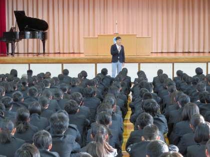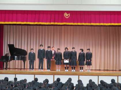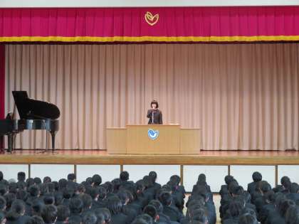 校歌斉唱に引き続き、生徒会からの話では本部役員の生徒が、3学期に向けて意識を高めて学校生活を送りましょうという話がありました。ぜひ、どの学年もそれぞれ高みをめざして頑張ってください。