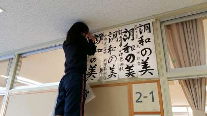 国語では冬休みに宿題として提出してもらった書き初めを、国語係と有志によって廊下へ貼り出す作業を行いました。