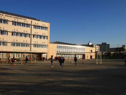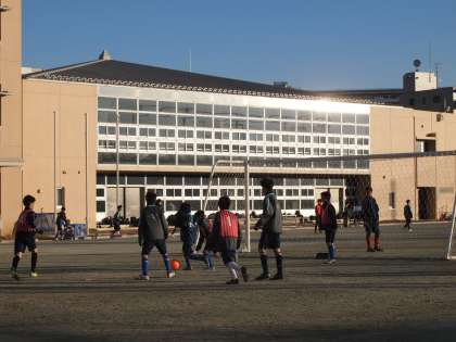 あいさつ運動で保護者の方が声をかけてくださっている時、校庭ではサッカー部も朝練習で元気よく体を動かしています。