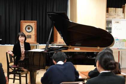 職業講話、旅行業者、カードゲームプランナー、作編曲者・ピアニストの講座の様子です。旅行業者の講師の先生からは修学旅行を例にご自身の仕事内容についてお話し頂きました。カードゲームプランナーの先生からは、カードゲームができるまでの仕組みや実物のカードを使った説明、作編曲者の先生からは実際にご自身が作曲した曲を披露してくれました。それぞれの先生方からプロの仕事を肌で感じることができました。(田村真)