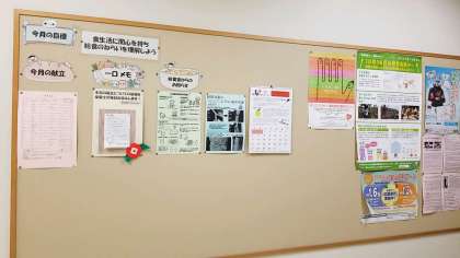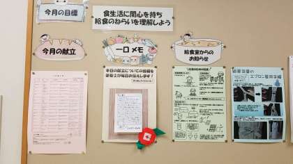 2階から4階のそれぞれの学年の廊下には給食にまつわる掲示が行われています。献立だけではなく、その材料にまつわる豆知識や給食が楽しみになるような掲示物が貼り出されています。