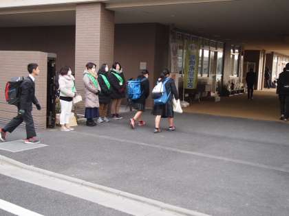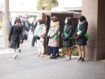 2年2組の保護者の方によるあいさつ運動最終日です。今朝は朝日が雲に隠れていて気温以上に寒さが身にしみる朝ですが、4名の保護者の方が生徒に朝の声かけをしていただきました。