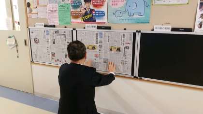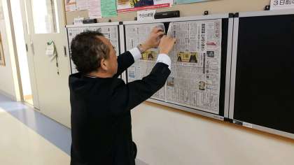 朝7時の船橋希望中学校職員室前では、校長先生がご自身でNIEのコーナーの記事貼り替えを行っています。