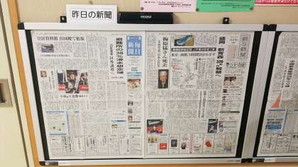 通りすぎる生徒が足を止め、記事を黙々と読んでいる姿も目にします。同じ内容の報道でも、新聞によって視点や意見に差が出ます。その面白さを感じてもらいたいと思います!まだ読んでいない皆さんは、ぜひ職員室前まで。