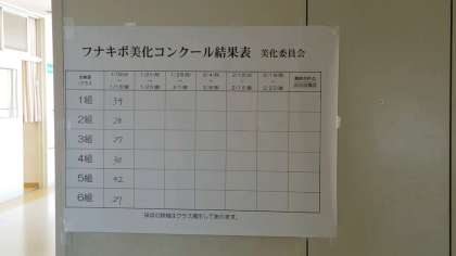 2年生の廊下にはこんな表が貼り出してありました。これは校内の「美化コンクール」に使う表で、教室内の決められた基準に沿って綺麗に保っているクラスを表彰するものです。