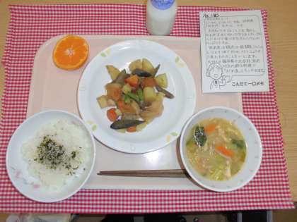 今日のごはんは、ふりかけをかけていただきます。ふりかけは、じゃことごま、青のり、わかめをよく炒ってつくりました。カルシウムたっぷりのふりかけになりました。
