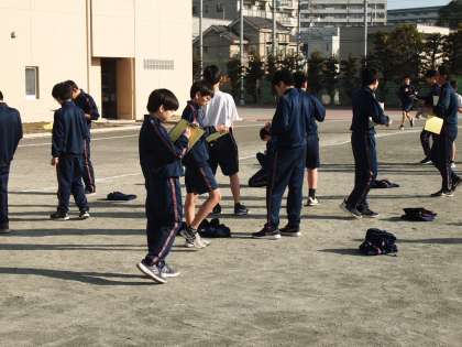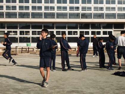 ペアを組んでいる生徒が、フィールド内で「前の周より3秒遅れているよ。がんばれー」「2秒上がった。その調子でファイト〜」など応援メッセージを送っています。そして校庭にはペースをつかむための音楽が流れています。今日は、レミオロメンの「粉雪」でした。