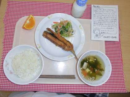 主菜は「さんまのかば焼き」です。さんまは秋にとれて形が刀に似ていることから「秋刀魚」と書きます。さんまには、良質のたんぱく質や貧血予防になる鉄分、粘膜を丈夫にするビタミンA、骨や歯の健康に欠かせないカルシウムなどたくさんの栄養が含まれています。よく噛んで食べて、体調管理に努めましょう!