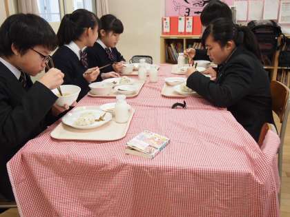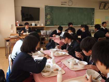 給食記念日のメニューに生徒はどんな反応かを確かめるべく3年生の教室におじゃましました。「いつもはもっと賑やかです」と担任の先生が言うように、みんな静かにおにぎりを黙々と食べています。給食容器には、きれいに並んだおにぎりが入っていました。