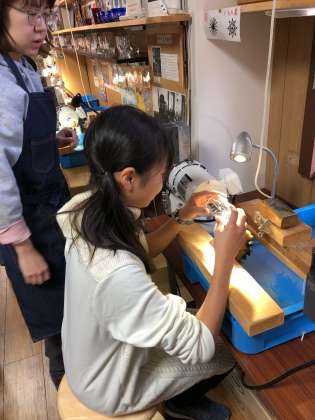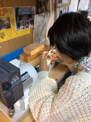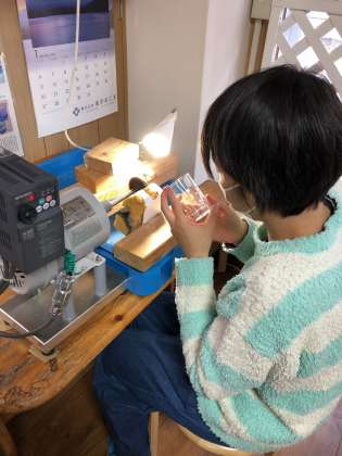 体験学習です。尾島ガラスで江戸切子の製作をしています。真剣な表情です。