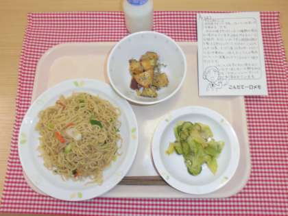「五目焼きそば」には12種類の食品が使われています。体をつくるもとになる栄養素が多く入った豚肉やえび、いか、うずらの卵、体の調子を整える栄養素が豊富な干ししいたけやたけのこ、にんじん、ねぎ、白菜、チンゲン菜、エネルギーのもとになる中華めんや油などたくさんの栄養素が入ったバランスのよい焼きそばが五目焼きそばです。