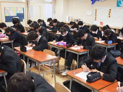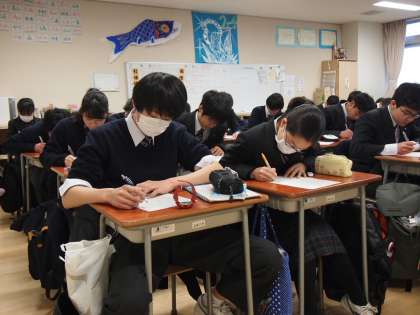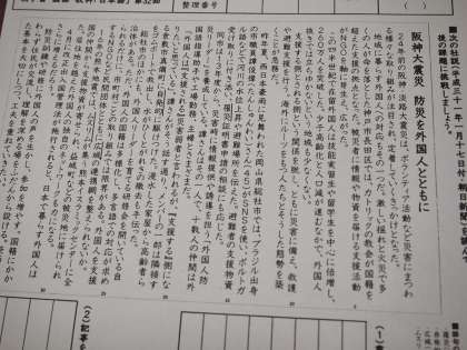 今朝2年生が取り組んでいるのが、社説の要約問題です。区内の全中学校で以前から取り組んでいるNIE活動一環で、社説を読んだ後要約と意見をまとめるものです。今日は、日本に住む外国人と手を取り合って防災を進めていくことへの意義と課題について書かれている社説に取り組んでいました。