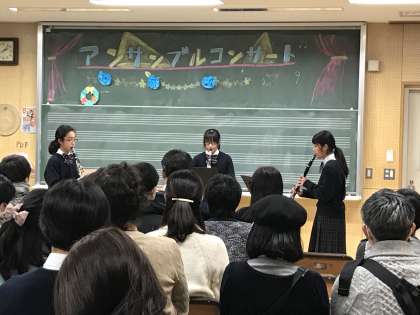 2月9日(土)本校音楽室にて、アンサンブルコンサートが行われました。先生の指揮のもと、みんなで1つの曲を奏でる普段の発表と違い、自分たちで息をあわせて演奏するアンサンブルは、とても難しかったようです。うまくいかなかったり、メンバーで喧嘩したりしたこともありましたが、本番はみんなで息をあわせて、楽しく演奏できたようです。(室田)