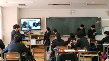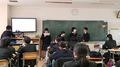 風鈴を作った班、ガラス細工に取り組んだ班、ハプニングに巻き込まれた班、面白いことがあった班…と、それぞれの班で校外学習を詳しく振り返っていました。パワーポイントにもそれぞれ工夫が見られましたね。クラスの中で代表に選ばれた班には、3月に学年の前で発表してもらうことになります。どの班になるのか楽しみです。