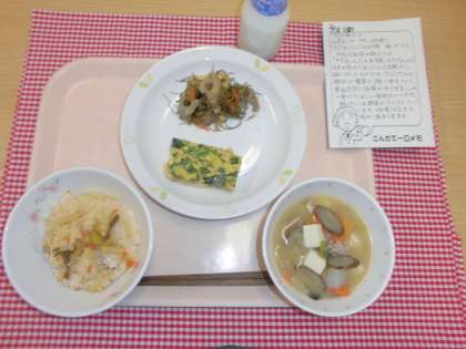 「きざみこんぶの五目煮」のきざみこんぶは、その名のとおりこんぶを乾かして細く切ったものです。こんぶはカルシウムや鉄分が豊富で、強い骨をつくり貧血を予防するのに効果があります。しっかり食べてほしい食材の1つです。