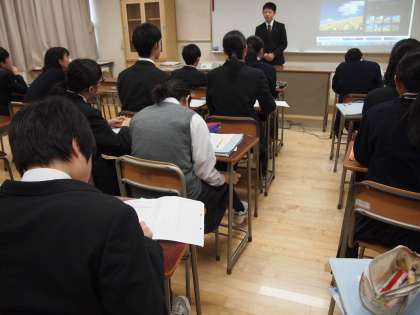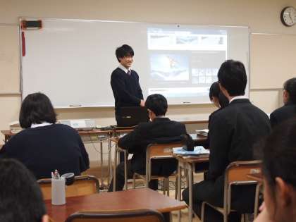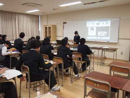 2年生のこちらのクラスは、自分が好きなものや好きなことについてspeechをしています。好きな芸能人のことや趣味など話題は様々。そして、友達のspeechの良いところを評価シートに記入しながら聞いています。