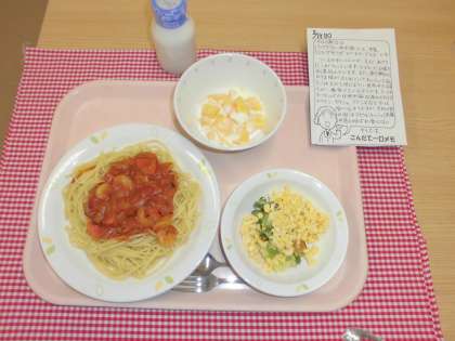 今日のスパゲティは地中海ソースでいただきます。ソースの中にいか、えび、あさり、たこを入れて、トマトソースでよく煮込んでつくりました。魚介類のうまみがよく出ているおいしいソースです。