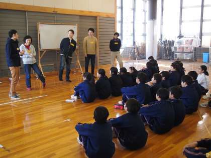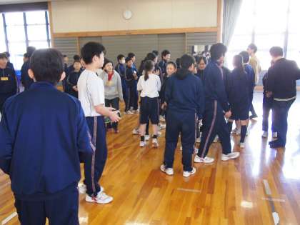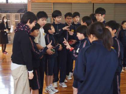 今日は、船橋希望学舎合同研究会で「演劇的手法を用いた授業」の研究に取組みました。授業は4校時から5校時の2時間続きで1年4組で実施。駒場のあごら劇場からゲストティーチャーに来ていただきました。ゲストティーチャーの自己紹介の後、誕生日順に全員が輪になってみるというお題が出されました。「一言もしゃべってはいけない」という条件なので、身振り手振りとアイコンタクトで挑戦。それでも時間内に並べたところはさすがフナキボ1年生です。