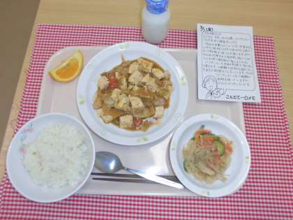 今日は中華のメニューです。中国は広いので地域によって料理や味付けが違います。四川は、山岳地帯なので香辛料(特にとうがらし)を使う料理が多いようです。今日の「四川豆腐」は少しピリ辛な味付けに仕上げました。