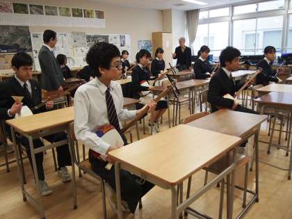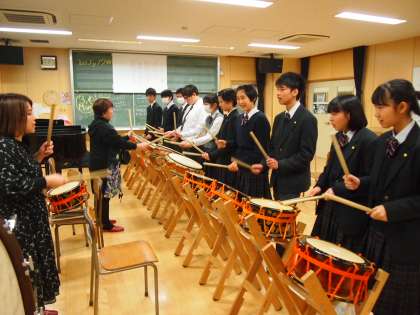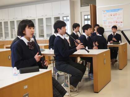 ほとんどが初挑戦の楽器です。特に尺八は難しく、毎年開始2分であきらめてしまう生徒もいるとのこと。しかし、粘り強く頑張っています。楽器はみなそうですが、音が出れば楽しいもの。あきらめず、やってみることの大切さも学んでいます。