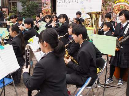 千歳船橋駅前の広場で毎年開かれている「3.11を忘れない!」に出演しているフナキボ吹奏楽部です。この催しのために3曲が用意して臨みました。演奏が始まると、とたんに聞きにきてくださる方がぞくぞくと集まってきました。