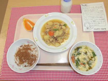 「肉じゃがうま煮」は、いろいろな野菜とじゃがいもをいっしょに煮込んでつくりました。じゃがいもは、フランスでは「大地のりんご」と呼ばれており、ビタミンCが豊富に含まれています。ビタミンCは、免疫力を高めて風邪予防に効果があります。