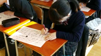 ピンク色の用紙に書き込まれた吹き出しの中に、時間いっぱい使ってメッセージを書きました。悩んで筆が止まる生徒、ものすごいスピードで書き込む生徒とさまざまでした。