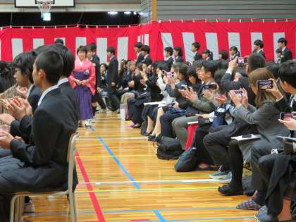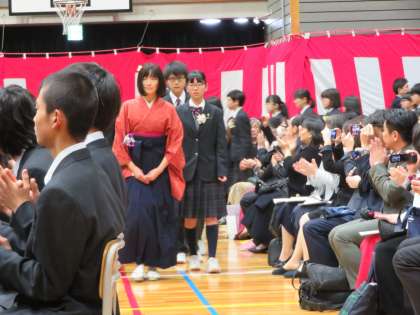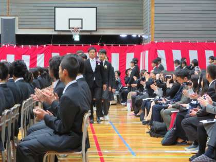 第7回卒業式が始まりました。7期生が入場を始めました。中学校生活最後の舞台、気持ちの入った堂々とした入場です。(田村真)