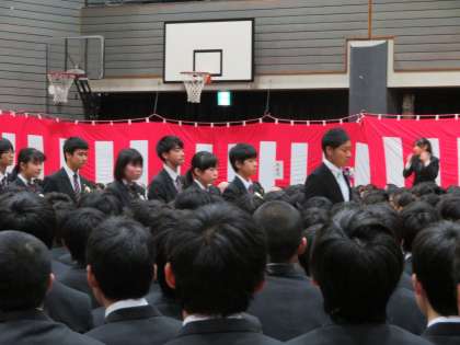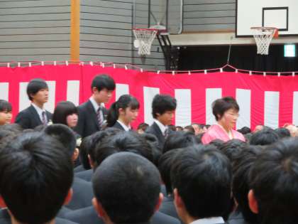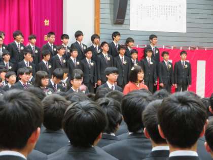 在校生による「この地球のどこかで」の合唱の中、3年生にとって最後の、そして最高の姿で立派に退場していきます。(田村真)