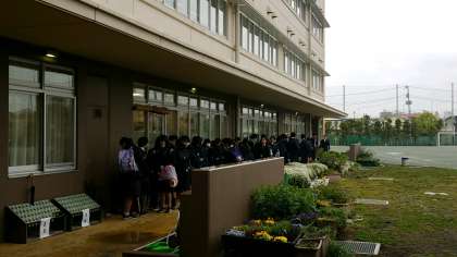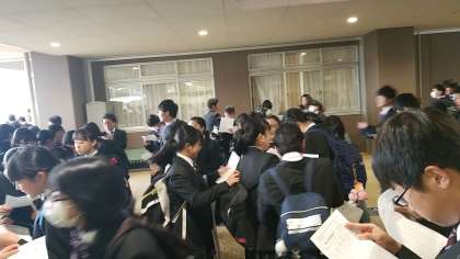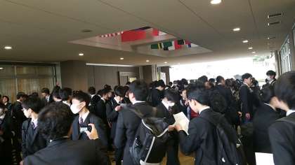 本日は始業式でしたが、新2・3年生の生徒たちは玄関で新クラスの発表の資料を受けとります。資料を受けとるために長蛇の列ができていました。