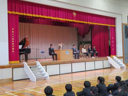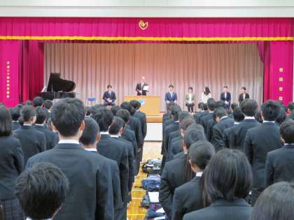 着任式の様子です。校長先生より昨年度で船橋希望中学校を去られた先生の紹介、そして新しく着任された教職員の紹介がありました。今年度も新しい先生方とも一緒に船橋希望中の教育活動を充実させていきます。(田村)