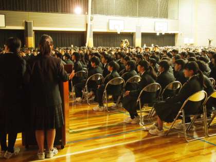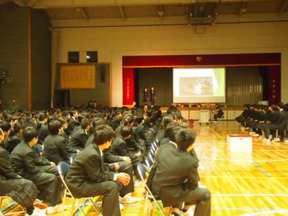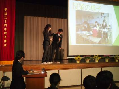 1時間目は、委員会や生徒会、そしてフナキボの学校生活を紹介する対面式です。先輩たちが分かりやすいように工夫したパワーボイントやパフォーマンスに1年生は釘付けになりました。