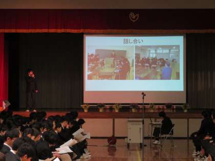 生徒会本部役員や各専門委員会から、学校や委員会の様子などの紹介がありました。ICTを活用し、わかりやすく説明しています。(田村)