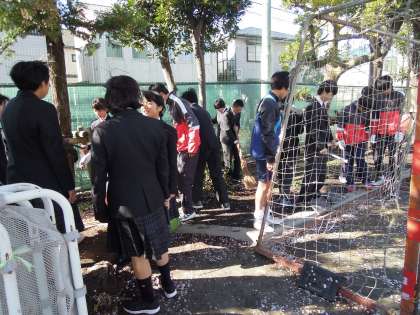 本日の登校時間に、生徒会役員と3年生の有志生徒たちによる、桜の花びら清掃が行われました。本日は風が強く、桜吹雪が舞い上がる中でしたが、たくさんの生徒たちが清掃活動に参加してくれました。ありがとうございます。(副校長)