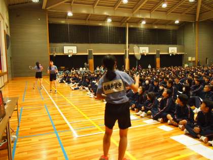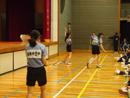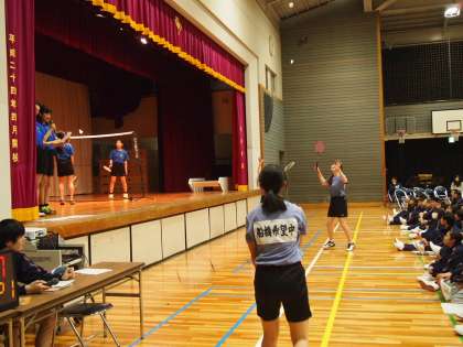 バドミント部です。シャトルを勢い良く打っています。