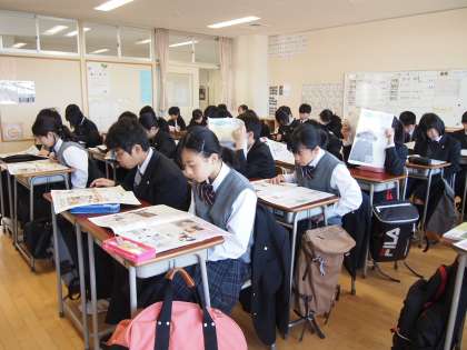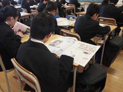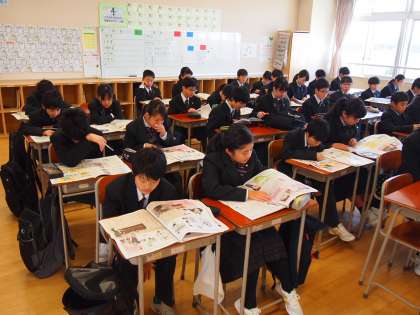 新年度最初のNIEタイム、そしてフナキボ10期生にとっては初体験となります。みんなで一斉に新聞を広げる雰囲気は普段の授業とはまた違う世界です。同じ新聞を広げているのに隣の人と違う記事を読んでいる。これこそが、様々なジャンルの記事が数ページの新聞に凝縮して掲載されている醍醐味です。