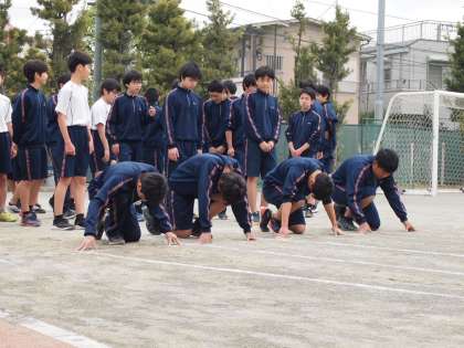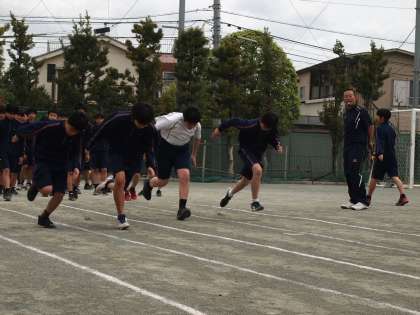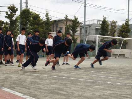 2年生の体育は、短距離走の練習です。スタート前の姿勢、そしてスタート直後はできるだけ姿勢を低く保つ練習をしています。