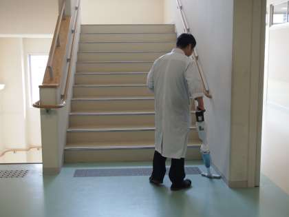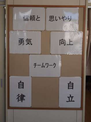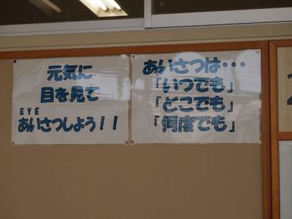 8時30分過ぎに校内を歩くと、様々なことに出会います。フナキボ伝統の「学年主任による清掃活動」ハンディー掃除機を持って各学年主任が階段や廊下を掃除しています。そして各学年の廊下には、スローガンが掲示してあります。