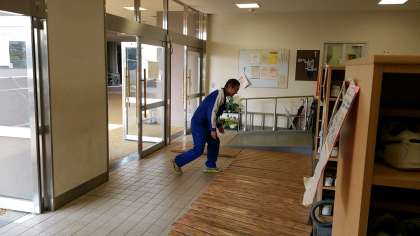 玄関をきれいに掃除し整え、クラスのために配布棚へ新聞を入れ、窓やドアをピカピカに磨いてくださります。船橋希望中学校の校舎が美しく保たれ、そして皆さんが毎日快適に過ごせるのはこうやって朝早くから働いてくださる方々のおかげです。皆さんの心がけで大事に校舎を使い、感謝の気持ちをもって毎日を過ごしましょう。