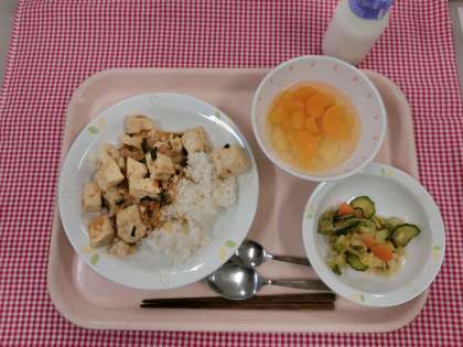 「麻婆豆腐」は、中国の四川料理のひとつで、ひき肉と豆腐をトウバンジャンなどの調味料で味付けしたものです。辛さが特徴の料理なので、ごはんとの相性も抜群です。もともとは少ない材料でも作ることができるよう考えられた料理ですが、給食では野菜もたくさん入れてつくりました。これ一皿で栄養バランスのとれた丼にしました。
