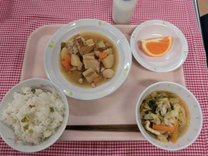 「グリンピースごはん」は、生のさやに入ったグリンピースを給食室で1つずつむいて、ごはんに炊き込みました。冷凍のグリンピースにはない、ホクホクとした食感でとってもおいしいです。グリンピースが苦手な人にもぜひ味わって食べてほしいです。