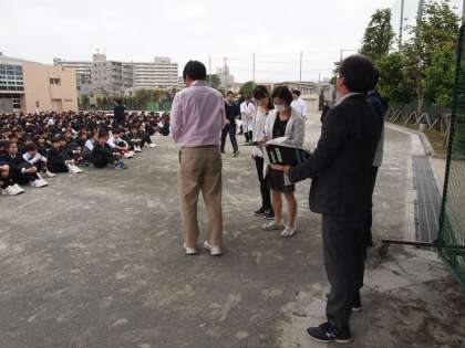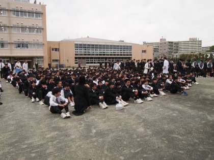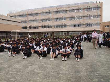 今日は、地震を想定した避難訓練です。全校生徒か700名を超えたフナキボでは、災害時に犠牲者を決して出さない!という固い決意を実現していくため、今まで以上に様々な形の避難訓練を実施していきます。今年度初めての避難訓練の今日、「訓練!地震です。…」の放送から校庭避難後に人数確認が終了するまで3分40秒。これだけの規模の学校で、しかも初めての1年生も含めた避難の時間としてはすばらしいタイムです。人数確認後の8期生の集団は早くもしゃべることなく静まりかえっています。それに影響されてか1年生も見事な集合整列です。