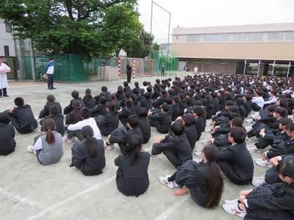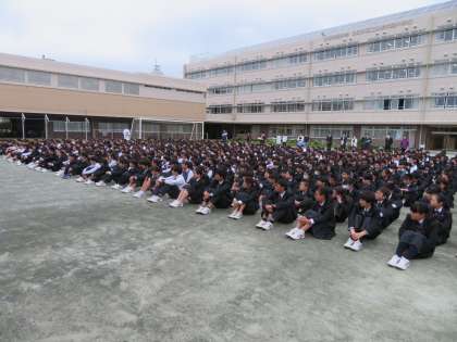 避難訓練の様子です。今年度はじめて、校庭に全校生徒が集合する形式で今日は行いました。全生徒の安全確認まで3分40秒と初回にしてはまずまずの成果であったと校長先生からも講評していただきました。今後も、まさかの備えに向けて本番のつもりで頑張りましょう。(田村)